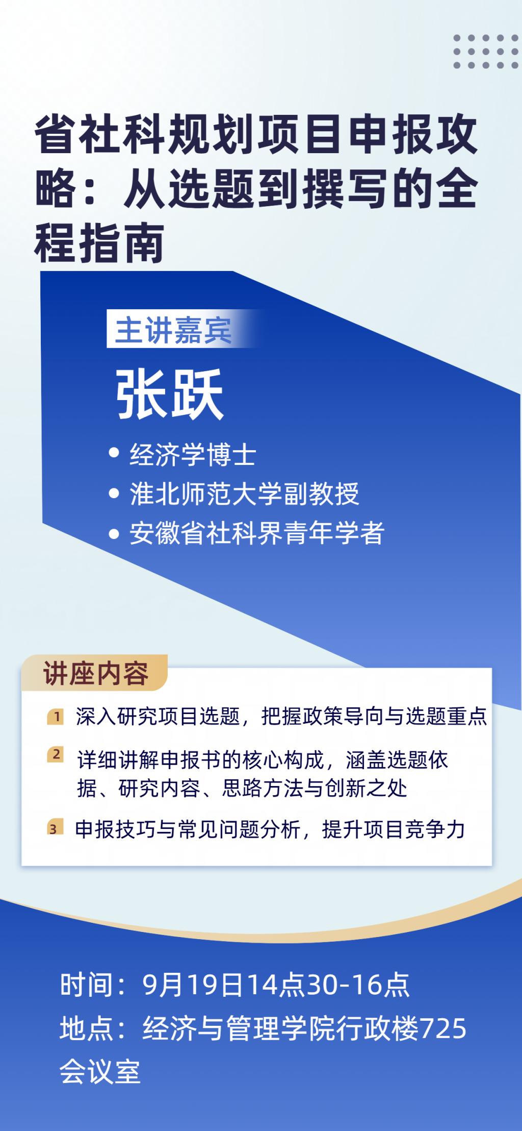 【学术讲座】--省社科规划项目申报攻略:从选题到撰写的全程指南--主讲嘉宾张跃副教授