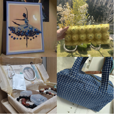 市场营销专业的高礼慧同学将废旧塑料瓶与笔芯结合制作塑料永生花摆件;人力资源专业的方月等同学将废旧快递纸盒改造成实用的桌面书架或美观的桌面摆件;经济学专业的蔡佳伊、胡明昭等同学把废旧鸡蛋托盘进行剪裁并加以手绘,制作成精美的风铃;物流管理专业的许娇萍、王梦茹等同学将废旧纸盒进行裁剪改装,制作成实用的日历挂件;经济学专业的刘思宇同学发挥个人特长,利用针线将废旧衣物进行裁剪、缝纫改造为实用挎包;电子商务专业的刘阳、张新颖等同学将一次性筷子、废旧纸箱、柚子皮相结合,制作成可简易的柚子空气净化器;除此之外还有各种笔筒、抽屉、垃圾桶、相框、肥皂盒的改造创意无限。