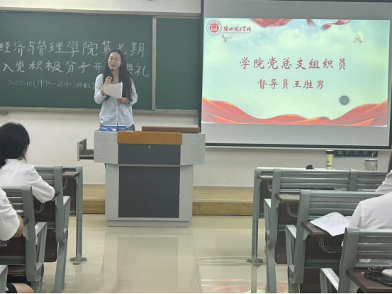 随后,教工支部组织员王胜男发表讲话。她首先对顺利进入本期培训班学习的89名学员表示热烈的祝贺,强调入党积极分子要端正学习态度,珍惜这次培训机会,要在思想和行动上向党组织积极靠拢。王胜男对全体学员提出要求和希望:一是理论学习别“佛系”,入党积极分子积极向党组织靠拢的征程中,理论学习是至关重要的基石;二是实践锻炼别“躺平”,学员们要积极参加社会实践和乡村振兴项目,要在实践锻炼中砥砺前行;三是思想成长别“掉队”,入党积极分子要定期向党组织汇报自己的思想、工作和学习情况,让党组织及时了解自己的思想动态。希望大家以这次培训为起点,把“小我”融入“大我”,让青春在党旗下绽放最耀眼的光芒!